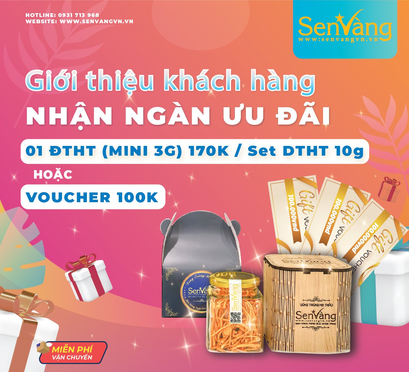 Giới thiệu Khách hàng mua đơn thành công thì Quý khách và người giới thiệu cũng nhận được Voucher giảm giá 100k hoặc set ĐTHT mini 3g trị giá 170k ( còn có cơ hội nhận hũ ĐTHT 10g trị giá 450k)